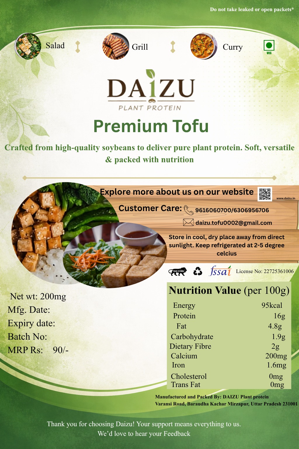 • Fresh & Silky Texture: Hamara tofu itna soft hai ki yeh bilkul dairy paneer jaisa feel deta hai aur har dish mein ghul jata hai.